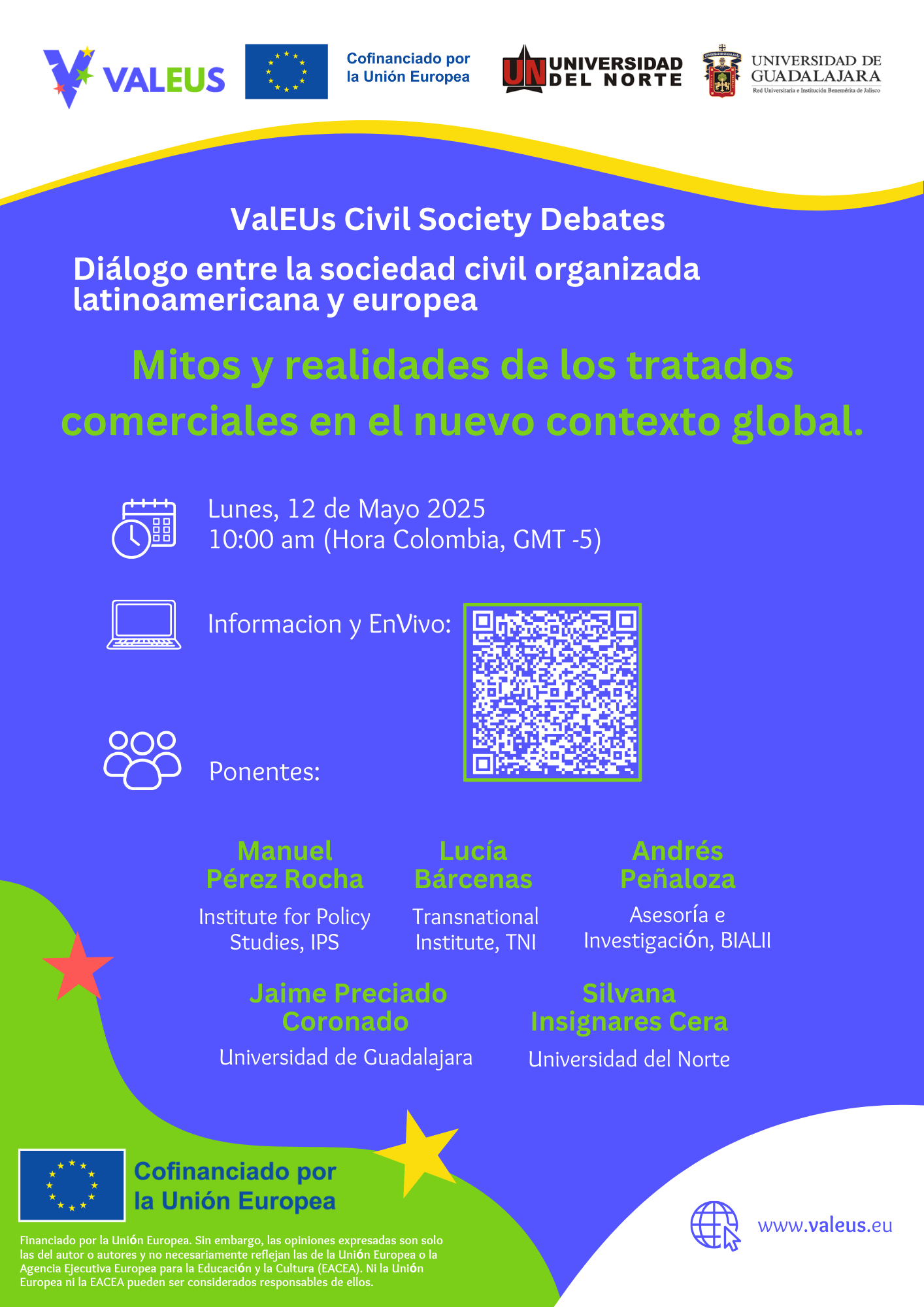 Revisa nuestro Debate de Sociedad Civil de ValEUs “Mitos y Realidades de los Tratados Comerciales en el Nuevo Contexto Global”, organizado por la Universidad de Guadalajara (México) en cooperación con la Universidad del Norte (Colombia) el 5 de mayo de 2025.