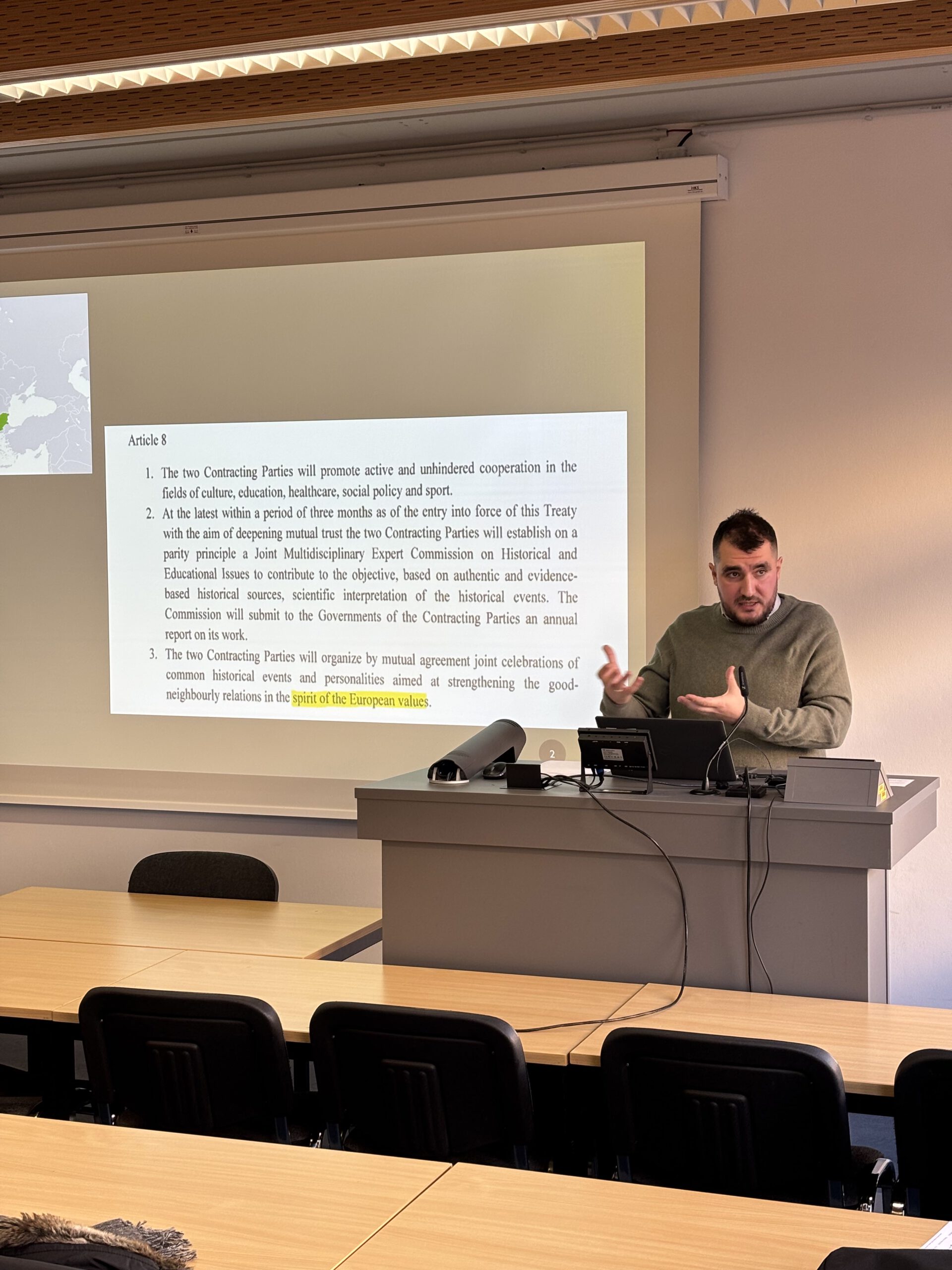 The lecture examines how disputes over history and memory become sites of societal and ontological security seeking in the context of the Bulgaria-North Macedonia relationship, highlighting the central role of intellectuals and commemorative practices in these processes. In two recently written chapters co-authored with Ivan Nikolovski, we argue that when states are perceived as failing to adequately defend national identity, intellectuals step in as key securitization actors by framing foundational historical narratives and memories as existentially threatened, thereby linking ontological and societal security through memory politics. Empirically, the lecture focuses on three contested commemorations, showing how co-claimed historical figures generate divergent paths of renegotiating the Macedonian national master narrative. These cases illustrate varying entanglements between national icons, temporal security, and securitization, revealing how struggles over the past continue to shape contemporary identity insecurity and political conflict.